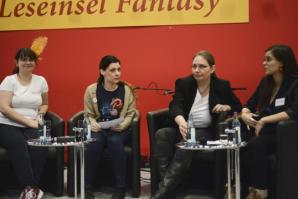 Und um 16.00 Uhr folgte dann meine letzte grosse Aufgabe des Tages – die Moderation unserer Nornennetz-Talkrunde zum Thema “Frauen in der Phantastik” auf der Leseinsel Fantasy. Dank meiner tollen Mitschwestern und kompetenten Talkerinnen Nike Leonhard, Nora Bendzko und Katherina Ushachov wurde die Runde ein voller Erfolg und wurde vom Publikum begeistert aufgenommen. Nach dem Talk kam sogar der Techniker zu uns und sagte: “Das war die beste und wichtigste Veranstaltung, die ich auf dieser Messe bisher gehört habe.” Im Signierbereich konnten wir dann noch eine halbe Stunde mit interessierten Zuhörern weiterdiskutieren, bevor ich dann ab 17.00 Uhr noch eine Stunde Standdienst beim Nornennetz hatte, die nur so verflog.
