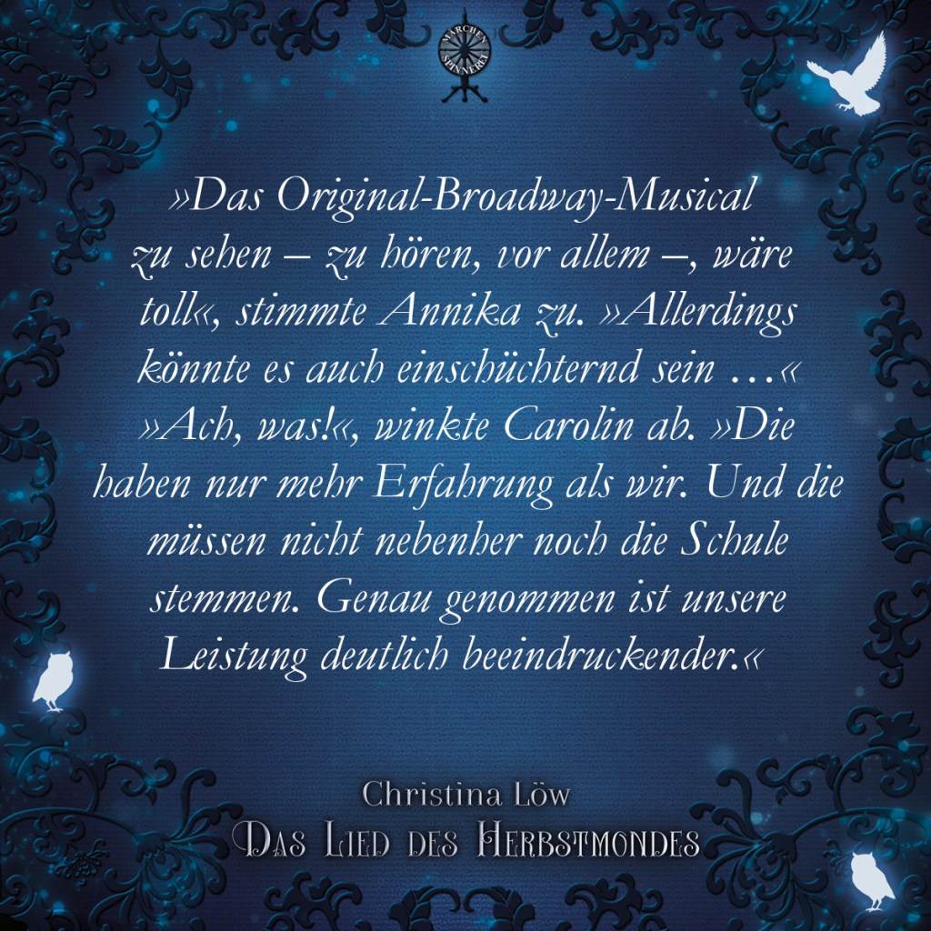Doch es geht in Herbstmond nicht nur um Eulen. Die Protagonistin der Geschichte, Carolin, ist auch ein grosser Musical-Fan; etwas, das mich mit ihr verbindet. Eins meiner liebsten Musicals ist Les Misérables (I dreamed a Dream = <3), aber einen ganz besonderen Stellenwert wird für mich immer mein allererstes Musical haben – nämlich Cats.